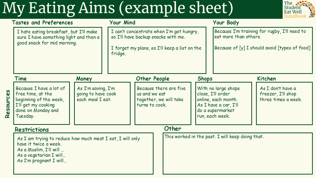 This one is filled in with some examples. We don't expect you to fill in everything, just use it to make notes about what matters to you. You can use these notes to help you fill in your Eat Well Strategy.